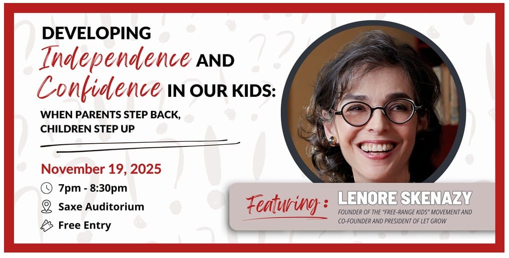 Join guest speaker, Lenore Skenazy, founder of the “Free-Range Kids” movement and co-founder and president of Let Grow, as she shares a powerful message about why fostering independence is essential for childhood growth and resilience. Drawing on her work with Let Grow, a nonprofit she co-founded with Jonathan Haidt (Author of The Anxious Generation), Skenazy will provide parents with insights and strategies to help children build confidence, self-reliance, and resilience in today’s world.